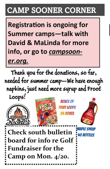 It's time to register for Camp Sooner. Get with David for more information about the Golf Tournament Fundraiser.