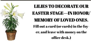 If you would like to purchase an Easter Lilly in memory of a loved one, just fill out a card and leave the card and $9.00 (each) on the office desk.